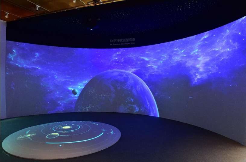 环幕(立体)投影系统是一种视听高度沉浸的虚拟仿真显示环境,采用多台投影(通道)组成的环形投影屏幕,环幕半径通常有100~360弧度不等。由于其屏幕半径宽大,观众的视觉完全被包围,再配合环绕立体声系统,是参与者充分体验一种高度身临其境的三维立体视听感受,获得一个具有高度沉浸感的虚拟仿真可视环境,是传统平幕显示设备不能比拟的,环幕投影重要的应用就是立体投影系统。